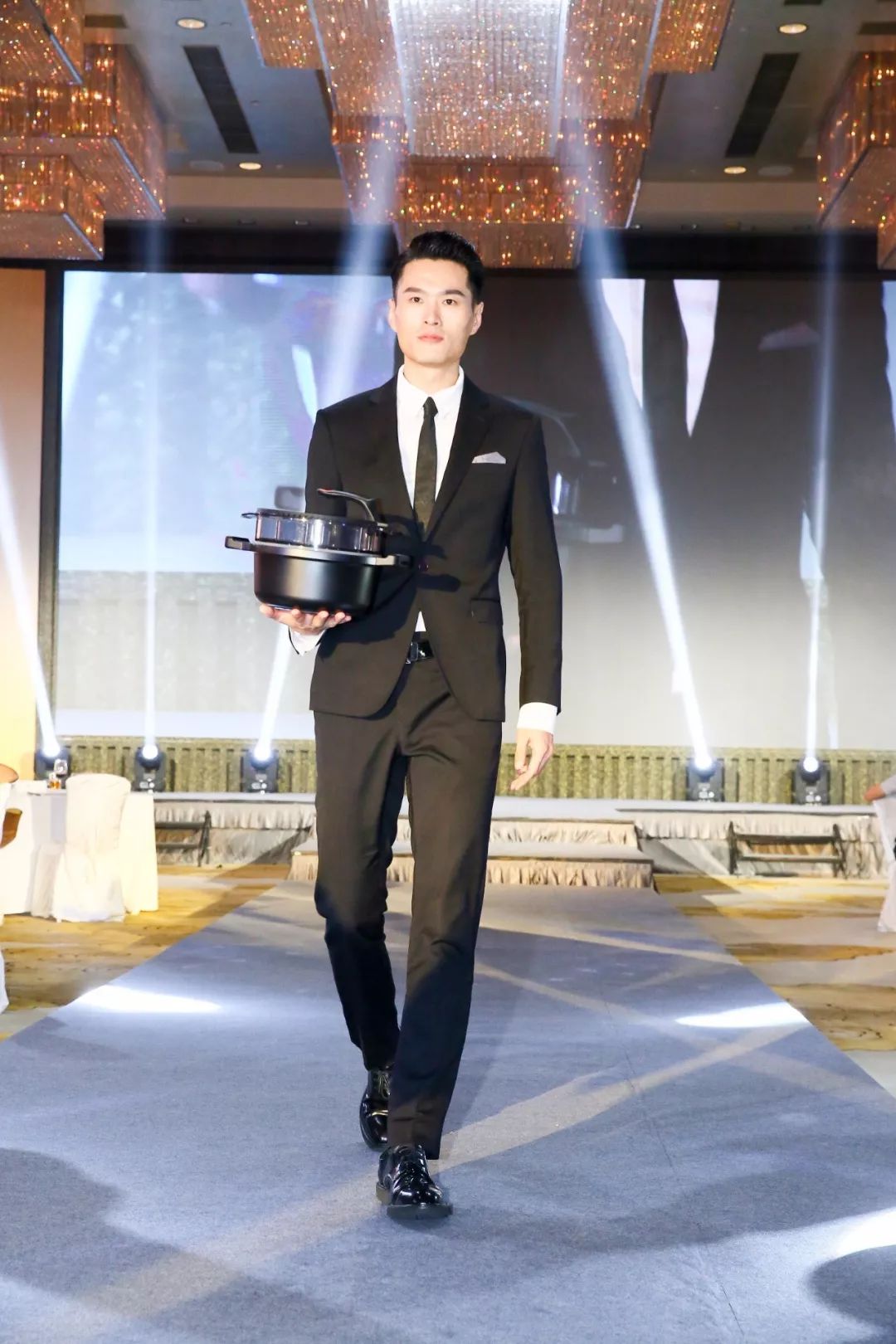 模特手中所拿的是帥帥公司出口的產品之一,該湯鍋帶蒸籠的多用設計,時尚的外觀、精致的做工、優質的不粘性能和多用的功能在本次頒獎典禮上大放異彩,獲得各界人士的好評。